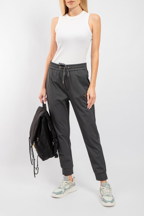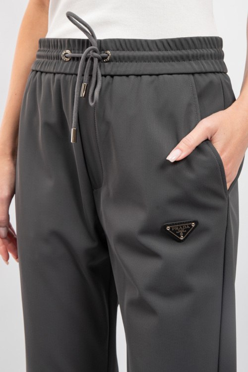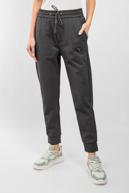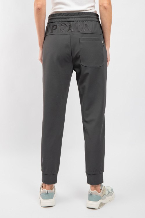 Детали: Женские темно-серые хлопковые спортивные брюки от Prada (Прада). Эластичный пояс на завязках, боковые карманы, накладной карман сзади, логотип спереди и сзади, трикотажные манжеты, полная длина
