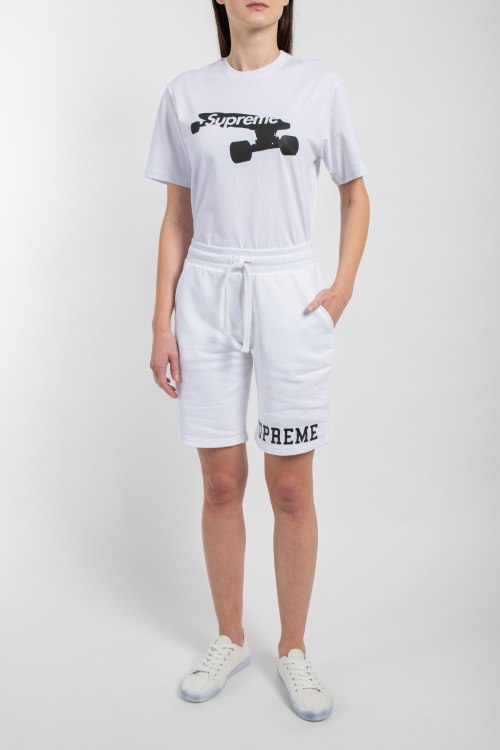 Женские спортивные шорты из хлопка от Supreme Spain (Суприм Спейн). Высокая посадка, эластичная резинка на поясе с кулиской, боковые карманы, один задний, принт с логотипом бренда.