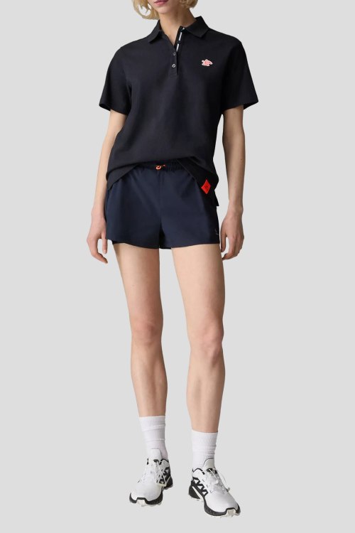 Детали: Женские темно-синие спортивные шорты Lilo от Bogner (Богнер). Выполнены из легкой водоотталкивающей ткани, дополнены эластичным поясом со шнурком, а также перфорированными деталями и логотипом, короткая длина