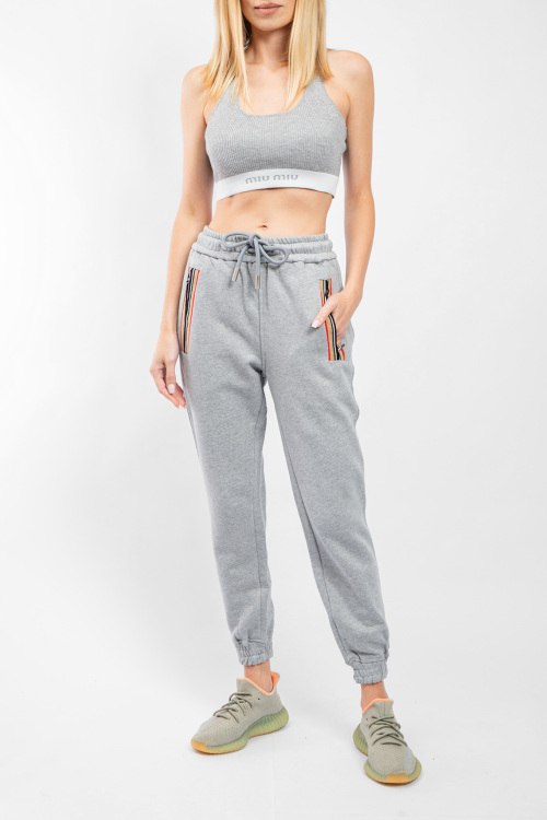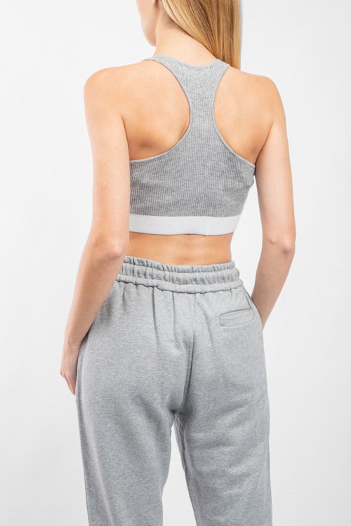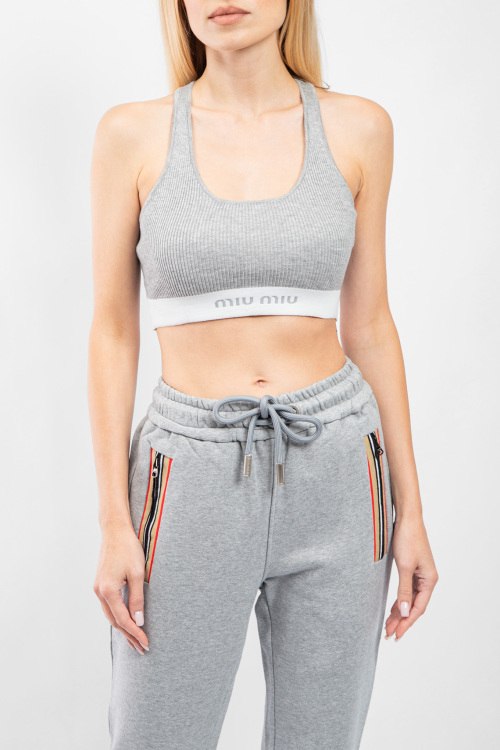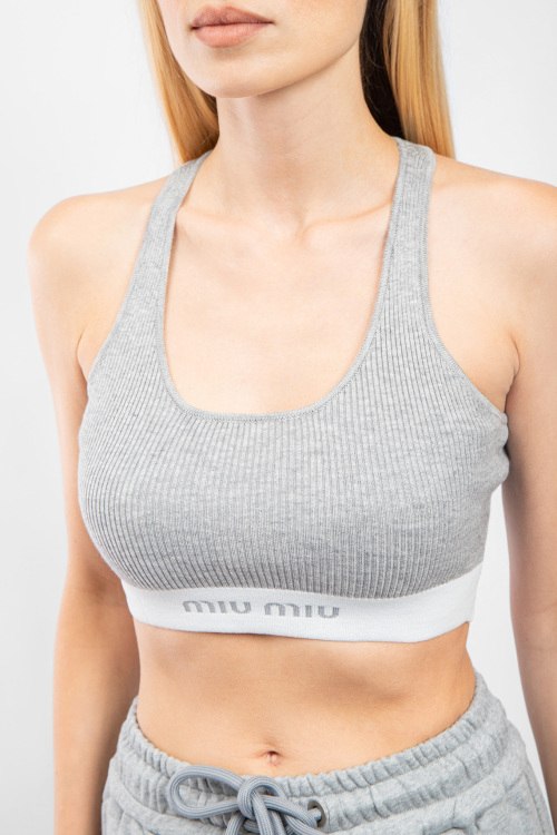 Женский серый трикотажный кроп-топ от Miu Miu (Миу Миу). Дизайн в рубчик, овальный вырез, нижний край с логотипом, укороченная длина.