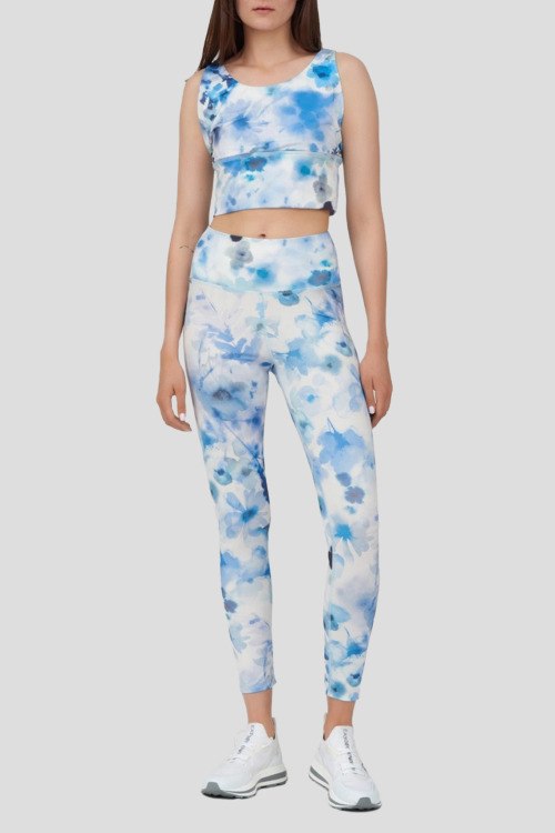 Женский бело-голубой костюм от Deha (Деха). Топ: модель без рукавов, цветочный принт, круглый вырез горловины, укороченная длина. Лосины: цветочный принт, высокая талия, облегающий фасон. Параметры модели: 78-62-92, рост 179 см