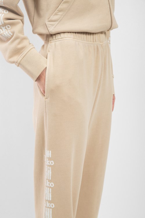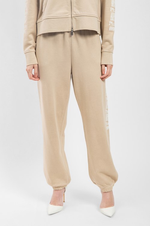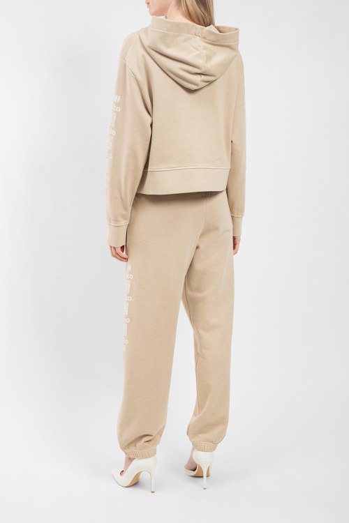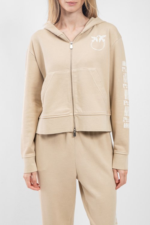 Женский бежевый хлопковый спортивный костюм от Pinko (Пинко). Кофта: вшитый капюшон, принт с логотипом на груди и на рукавах, боковые карманы, застежка-молния, классическая длина. Брюки: эластичный пояс, боковые карманы, принт с логотипом, манжеты на резинке, полная длина.