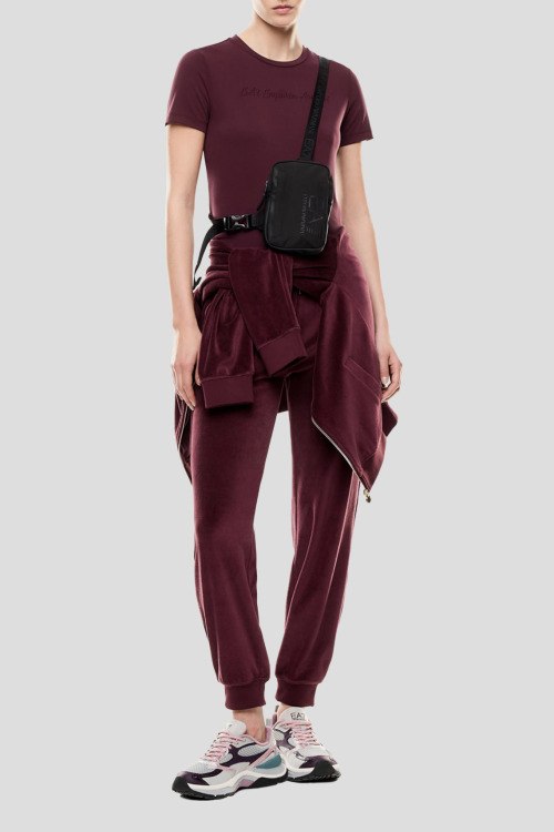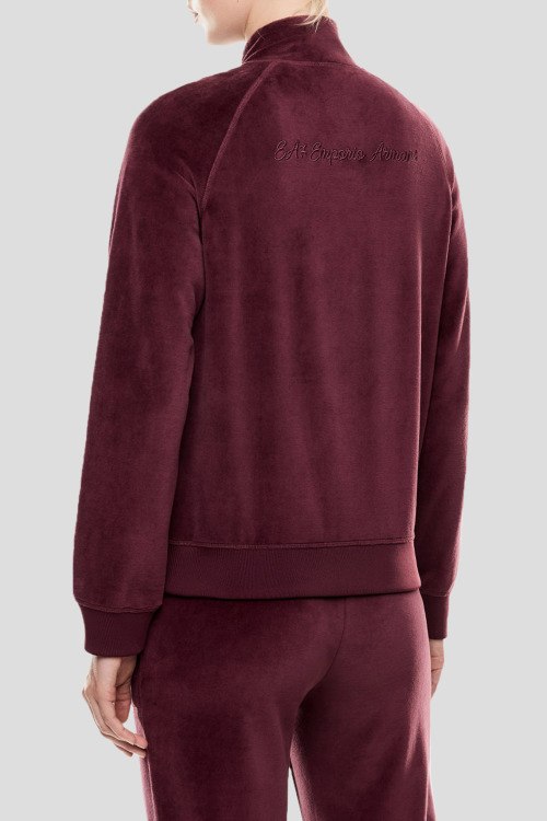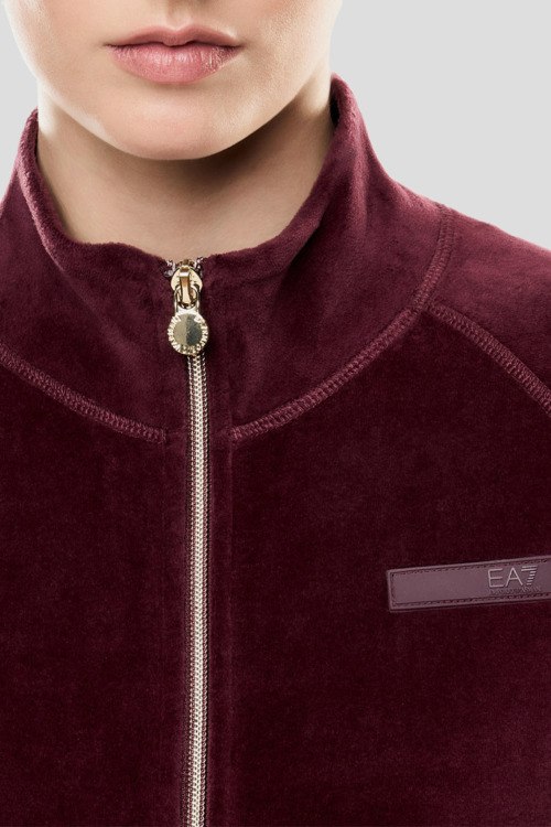 Детали: Женский бордовый велюровый спортивный костюм от EA7 Emporio Armani (ЕА7 Эмпорио Армани). Кофта: логотип на груди, высокий воротник, боковые карманы, застежка-молния, классическая длина, трикотажные манжеты и нижний край. Брюки: эластичный пояс на завязках, боковые карманы, вышитый логотип, трикотажные манжеты, полная длина