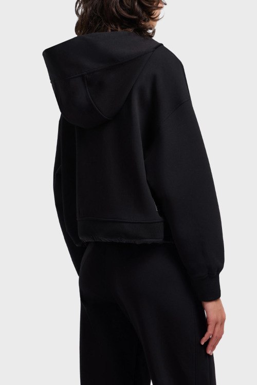 Детали: Женский черынй спортивный костюм из хлопкового микса от Emporio Armani (Эмпорио Армани). Кофна с капюшоном на молнии, накладные карманы, брюки прямого кроя, высокая посадка, эластичная резинк ана поясе с кулиской