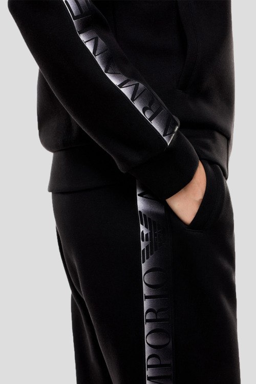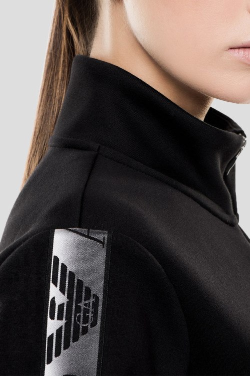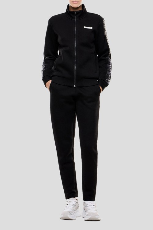 Детали: Женский черный хлопковый спортивный костюм от EA7 Emporio Armani (ЕА7 Эмпорио Армани). Кофта: логотип на груди, высокий воротник, брендированные лампасы, боковые карманы, застежка-молния, классическая длина, трикотажные манжеты и нижний край. Брюки: эластичный пояс, боковые карманы, брендированные лампасы, низ без манжетов, полная длина