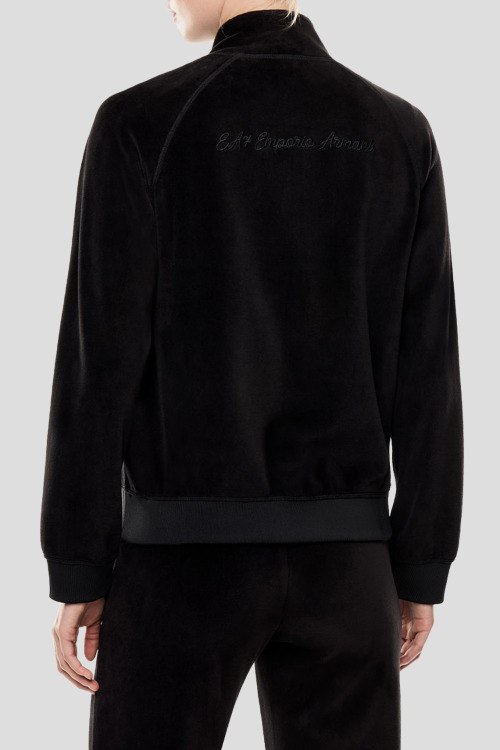 Детали: Женский черный велюровый спортивный костюм от EA7 Emporio Armani (ЕА7 Эмпорио Армани). Кофта: логотип на груди, высокий воротник, боковые карманы, застежка-молния, классическая длина, трикотажные манжеты и нижний край. Брюки: эластичный пояс на завязках, боковые карманы, вышитый логотип, трикотажные манжеты, полная длина