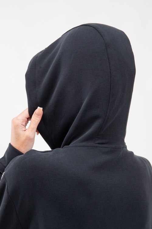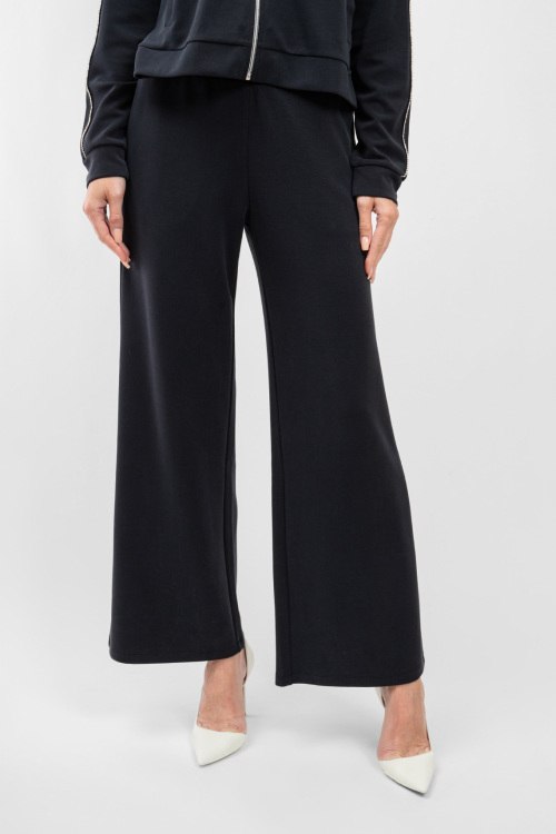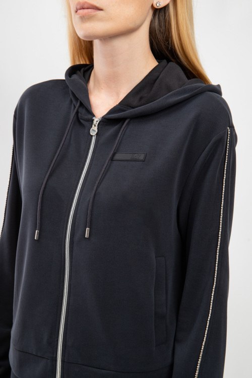Женский черный трикотажный спортивный костюм от EA7 Emporio Armani (ЕА7 Эмпорио Армани). Кофта: капюшон на завязках, логотип на груди, кристаллы вдоль рукавов, боковые карманы, застежка-молния, классическая длина. Брюки: эластичный пояс, боковые карманы, широкий крой, полная длина.