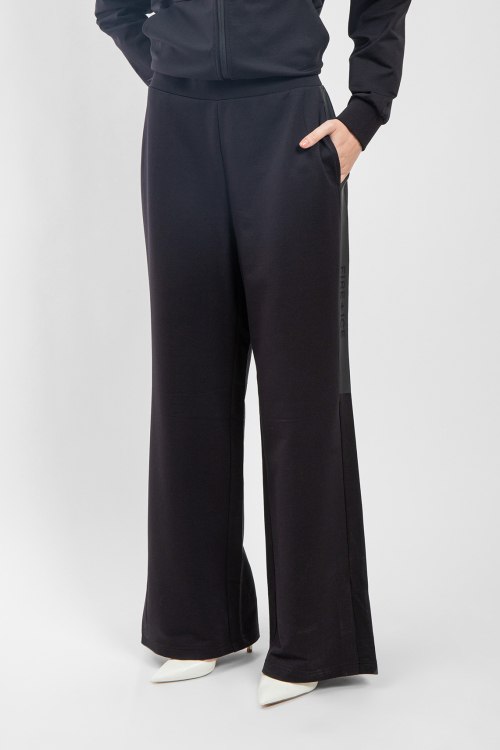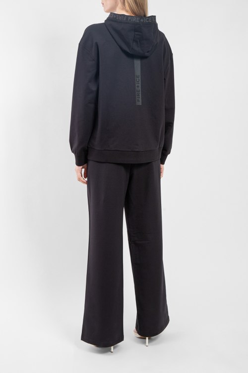 Женский черный хлопковый спортивный костюм Enia от Bogner (Богнер). Кофта: вшитый капюшон, боковые карманы, застежка-молния, классическая длина, трикотажные манжеты и нижний край. Брюки: эластичный пояс, брендированные лампасы, боковые карманы, расклешенный крой, полная длина.