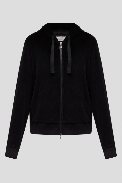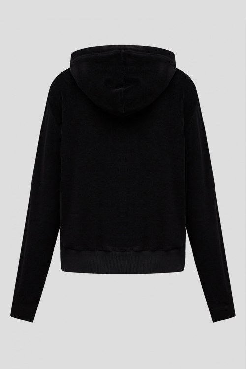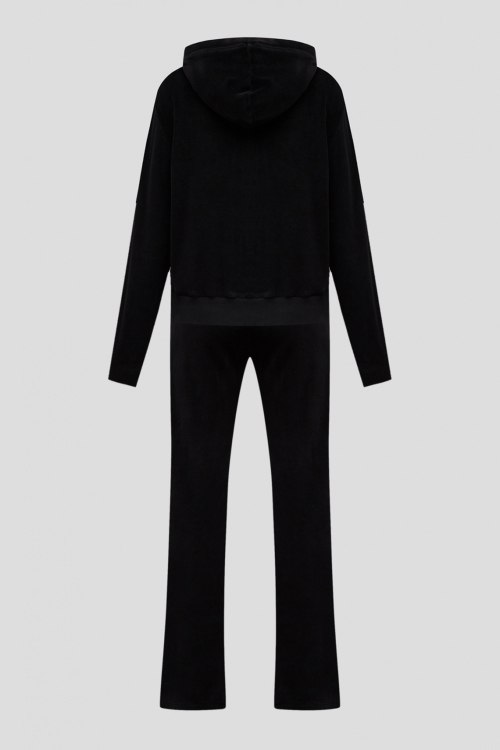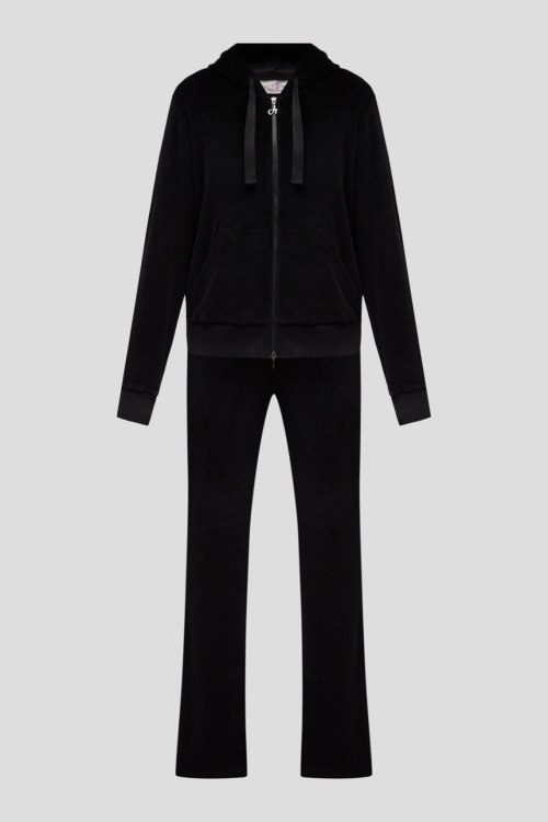 Женский черный велюровый спортивный костюм от Deha (Деха). Кофта: капюшон на завязках, боковые карманы, застежка-молния, классическая длина. Замеры: длина рукава: длинный, для размера S - 60 см, обхват груди: для размера S - 98 см, обхват талии: для размера S - 94 см, длина изделия по среднему шву спинки от горловины: для размера S - 55 см. Брюки: эластичный пояс на завязках, низ без манжетов, полная длина. Замеры: обхват пояса: для размера S - 66 см, обхват бедер: для размера S - 94 см, длина штанины: для размера S - 99 см, длина по шаговому шву: для размера S - 76 см