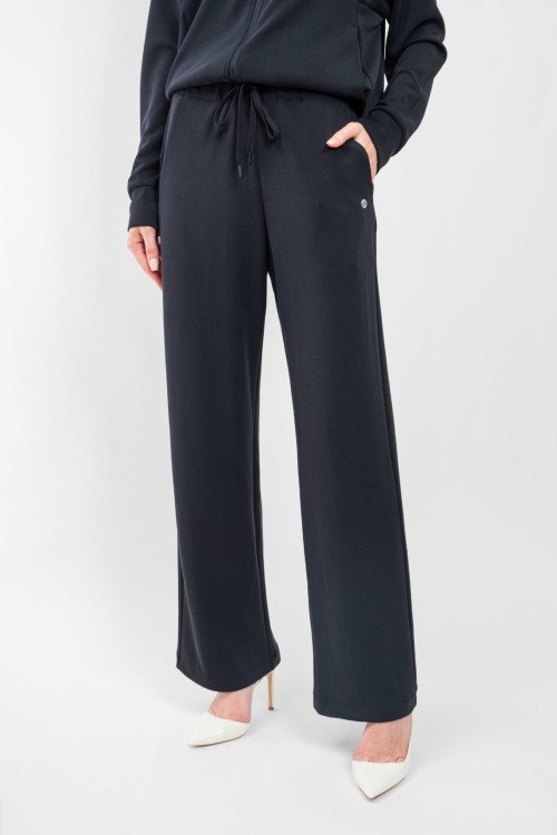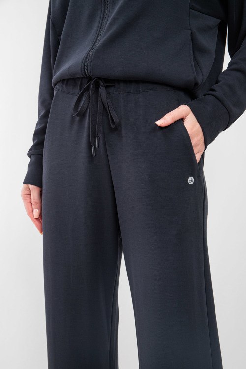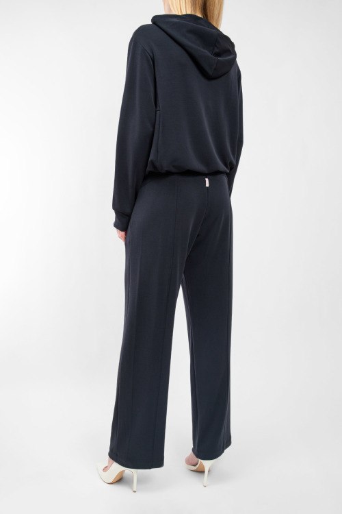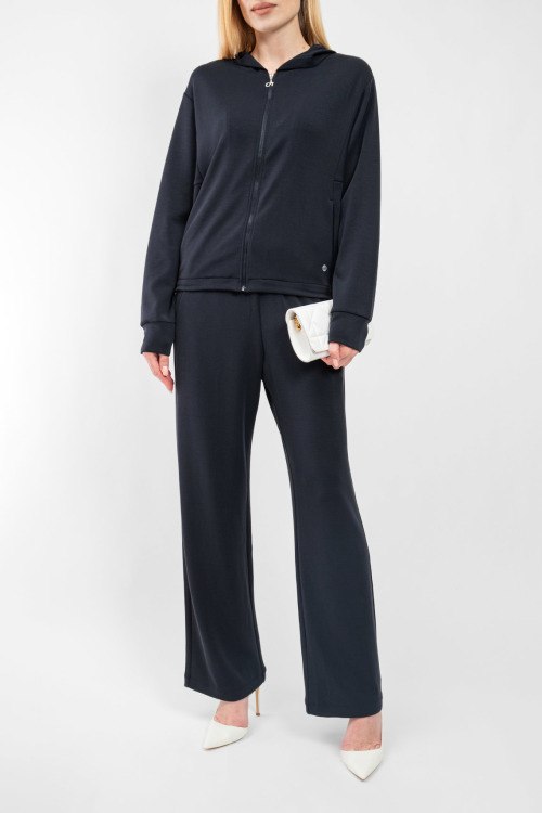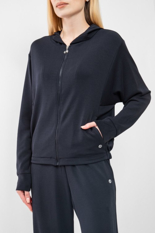 Женский черный спортивный костюм от Deha (Деха). Кофта: вшитый капюшон, боковые карманы, застежка-молния, классическая длина. Брюки: эластичный пояс на завязках, боковые карманы, низ без манжетов, полная длина.