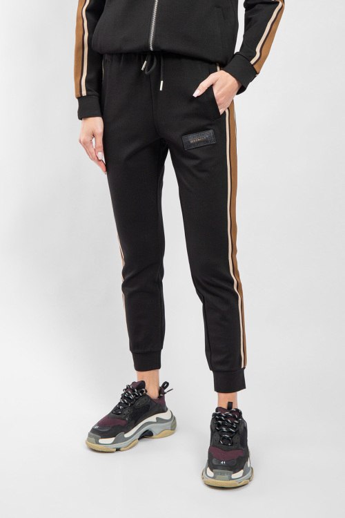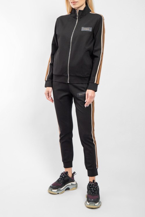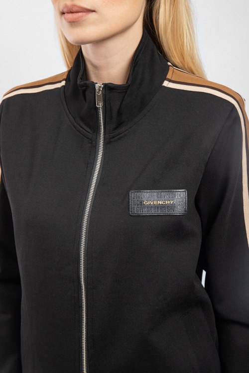 Детали: Женский черный хлопковый спортивный костюм от Givenchy (Живанши). Кофта: логотип на груди, высокий воротник, лампасы вдоль рукавов, боковые карманы, застежка-молния, классическая длина, трикотажные манжеты и нижний край. Брюки: эластичный пояс на завязках, боковые карманы, нашивка с логотипом, лампасы, трикотажные манжеты, укороченная длина