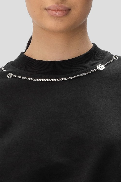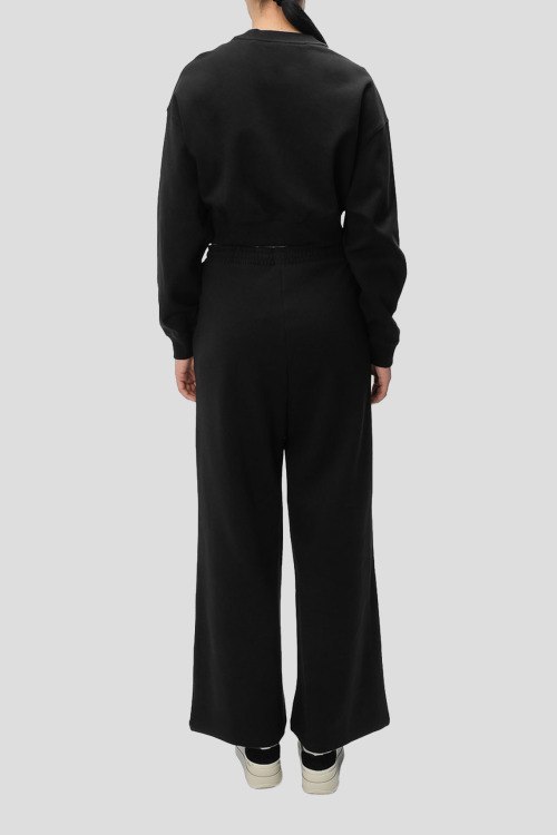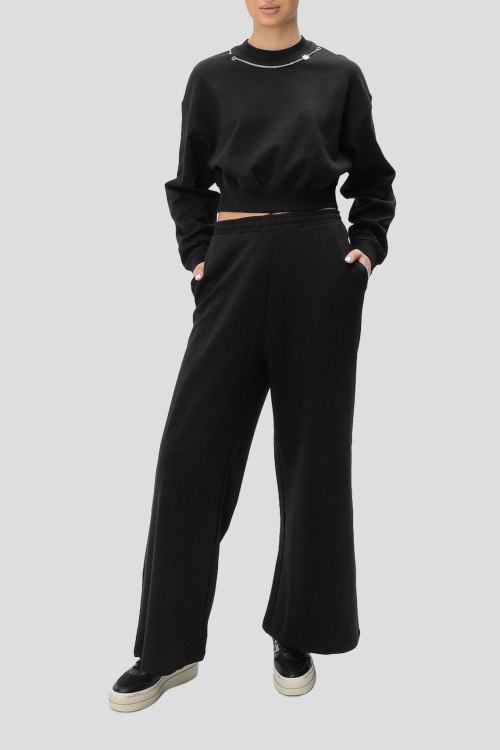 Детали: Женский черный прогулочный костюм Dewita из хлопкового микса от Hugo Boss (Хуго Босс). Укороченный свитшот с декоративной цепочкой вдоль горловины, длинные рукава, манжеты и низ изделия в рубчик, расклешенные брюки с высокой посадкой, эластичная резинка на поясе с кулиской, прорезные карманы, расклешенная модель