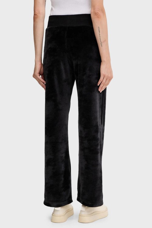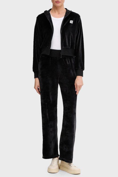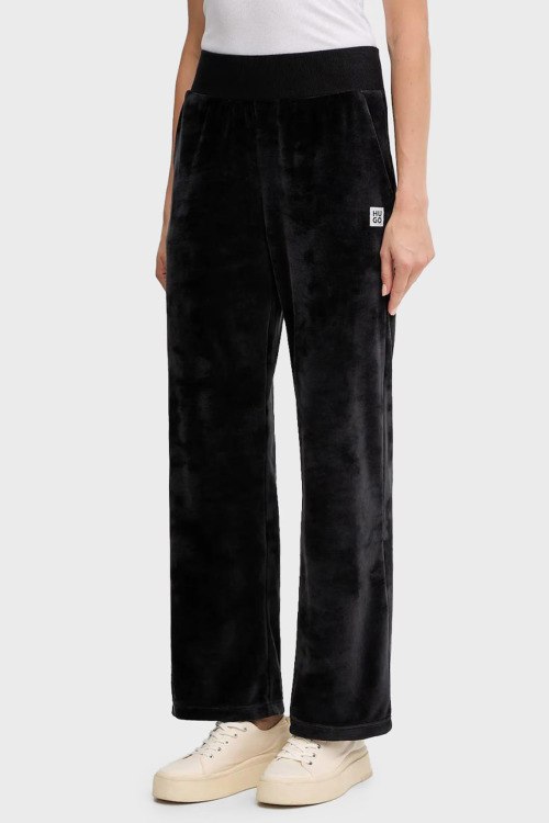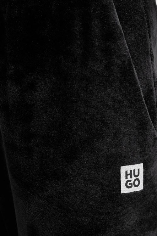 Детали: Женский черный велюровый спортивный костюм от Hugo by Hugo Boss (Хуго бай Хуго Босс). Кофта: модель с капюшоном, логотип на груди, классическая длина, трикотажные манжеты и нижний край. Брюки: эластичный пояс, логотип, боковые карманы, низ без манжетов, полная длина