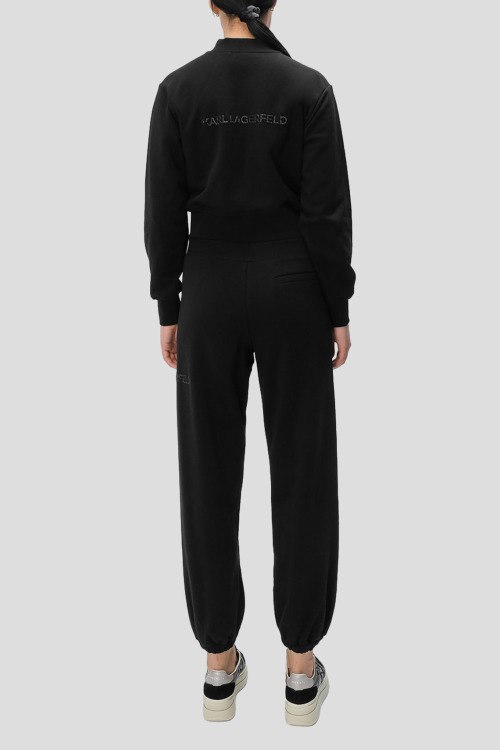 Детали: Женский черный спортивный костюм из хлопкового микса от Karl Lagerfeld (Карл Лагерфельд). Спортивная кофта на молнии, длинные рукава, трикотажная резинка на манжетах и по низу изделия, спортивные брюки с манжетами, эластичная резинка на поясе, прорезные карманы, логотип бренда