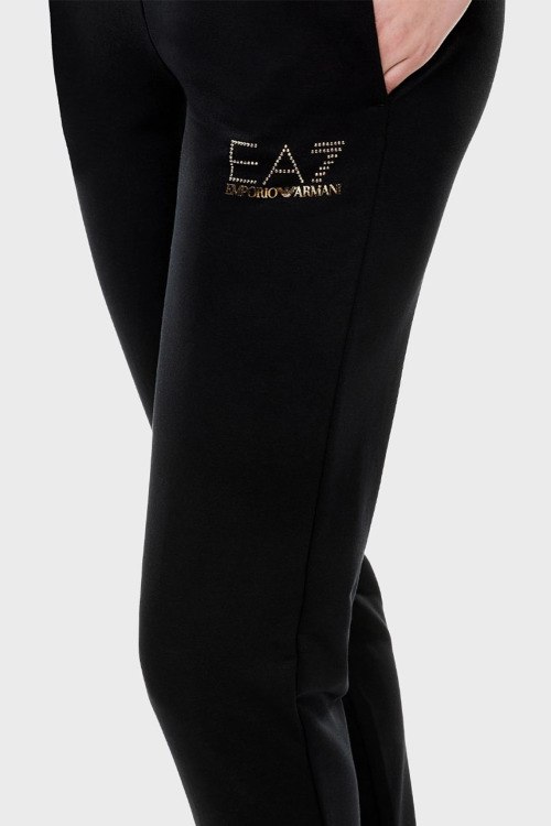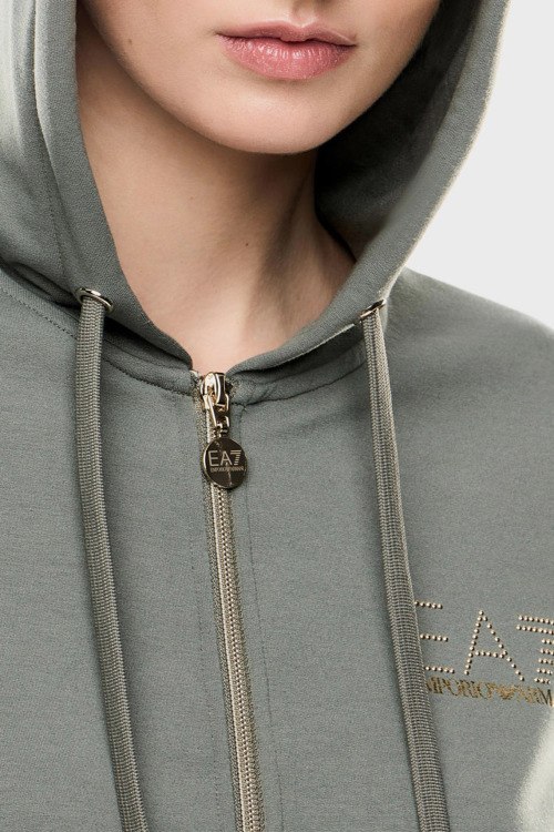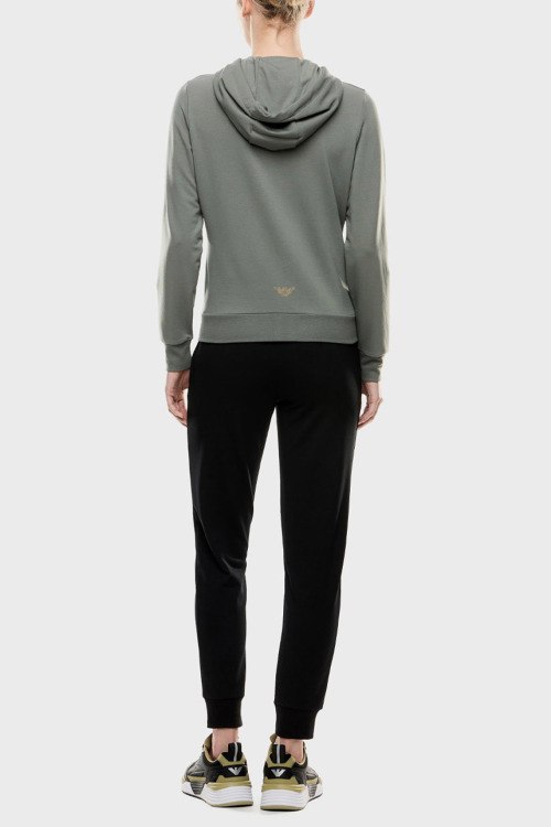 Детали: Женский черно-зеленый спортивный костюм от EA7 Emporio Armani (ЕА7 Эмпорио Армани). Кофта: капюшон на завязках, логотип на груди, боковые карманы, застежка-молния, классическая длина, трикотажные манжеты и нижний край. Брюки: эластичный пояс, логотип, боковые карманы, трикотажные манжеты, полная длина