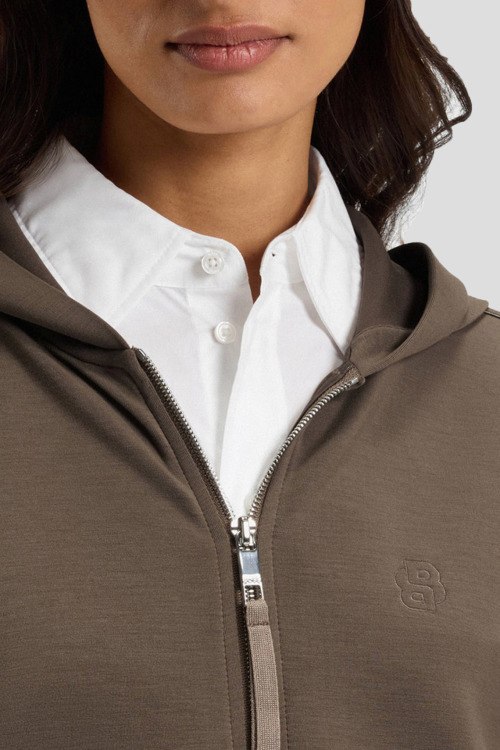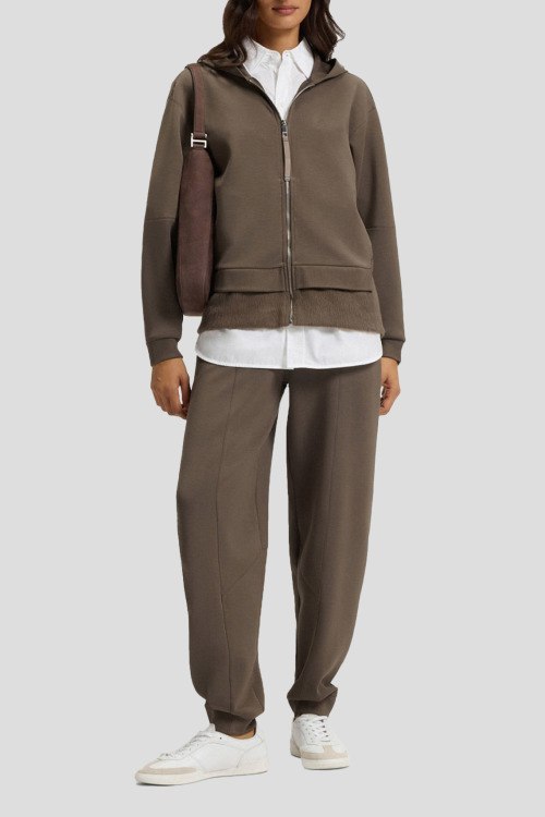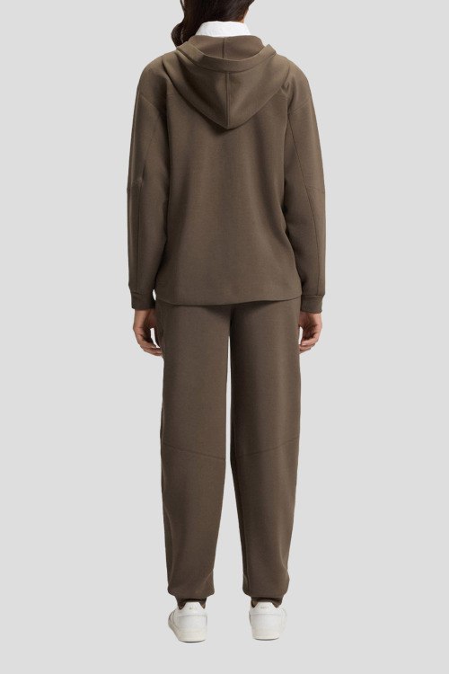 Детали: Женский коричневый спортивный костюм Edaree от Hugo Boss (Хуго Босс). Кофта: модель с капюшоном, боковые карманы, застежка-молния, классическая длина. Брюки: эластичный пояс, боковые карманы, полная длина