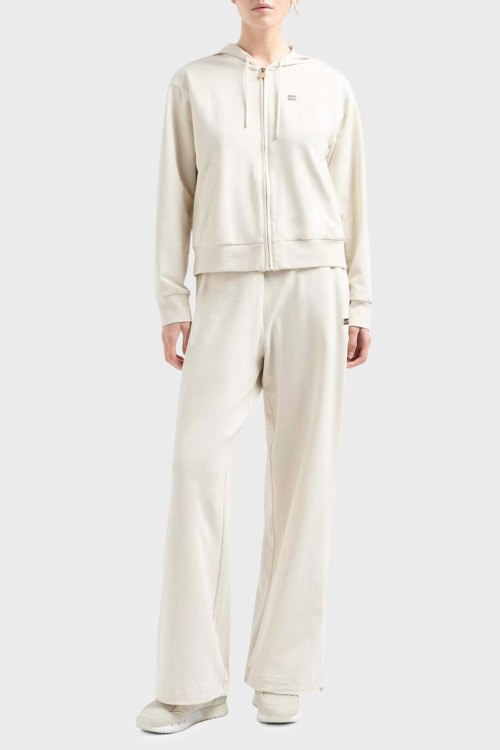 Детали: Женский спортивный костюм молочного оттенка из хлопкового микса т EA7 Emporio Armani (ЕА7 Эмпорио Армани). Спортивная кофта на молнию, вшитый капюшон с кулиской, спортивные брюки прямого кроя, эластичная резинка на поясе