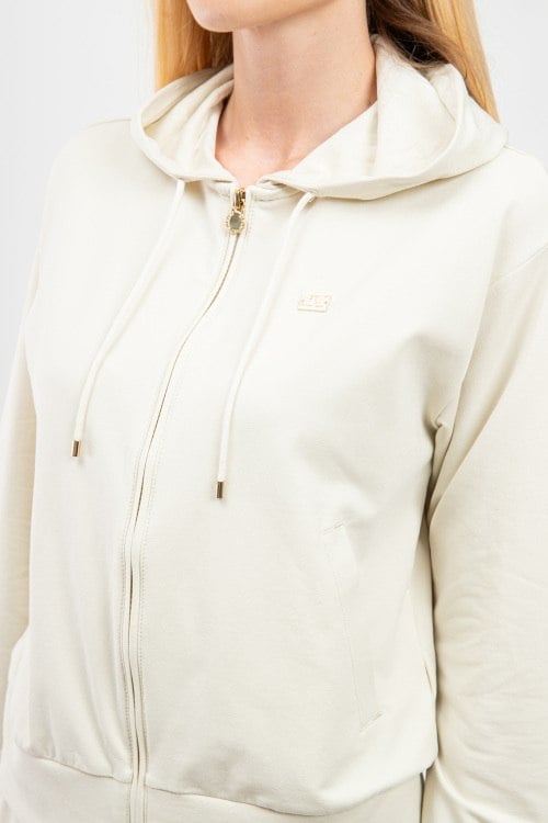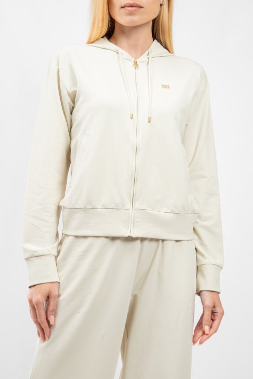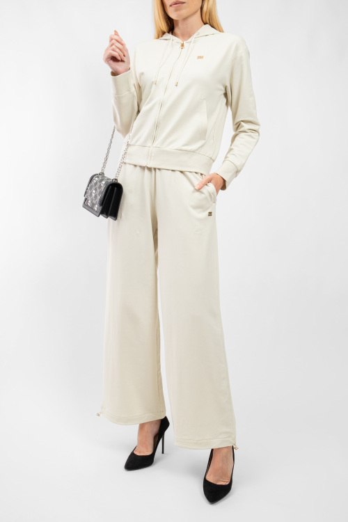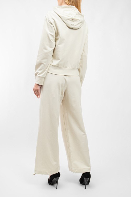 Женский хлопковый спортивный костюм молочного оттенка от EA7 Emporio Armani (ЕА7 Эмпорио Армани). Кофта: капюшон на завязках, логотип на груди, боковые карманы, застежка-молния, классическая длина, трикотажные манжеты и нижний край. Брюки: эластичный пояс, нашивка с логотипом, боковые карманы, низ на затяжке, полная длина.