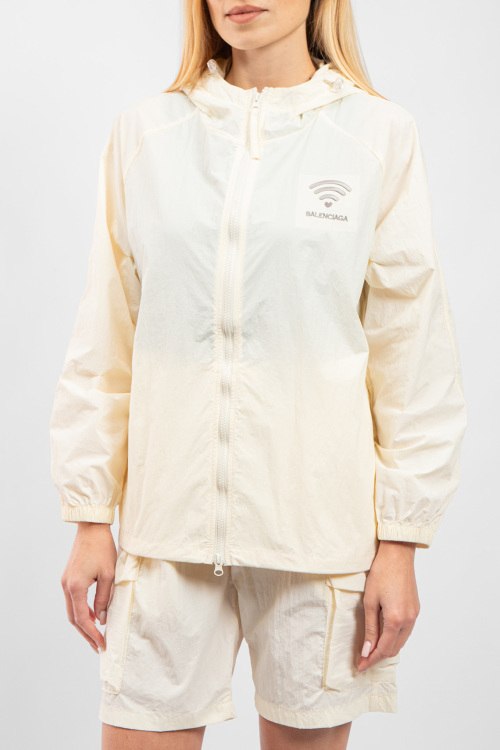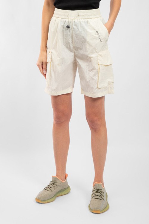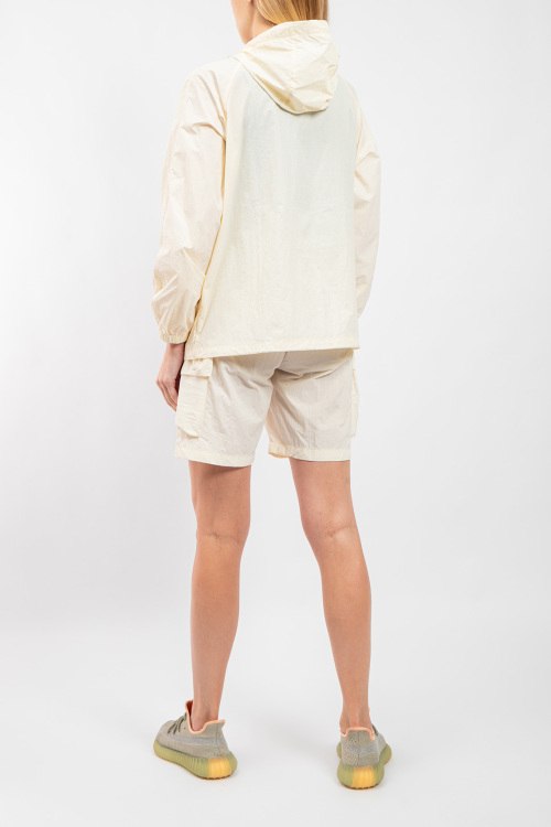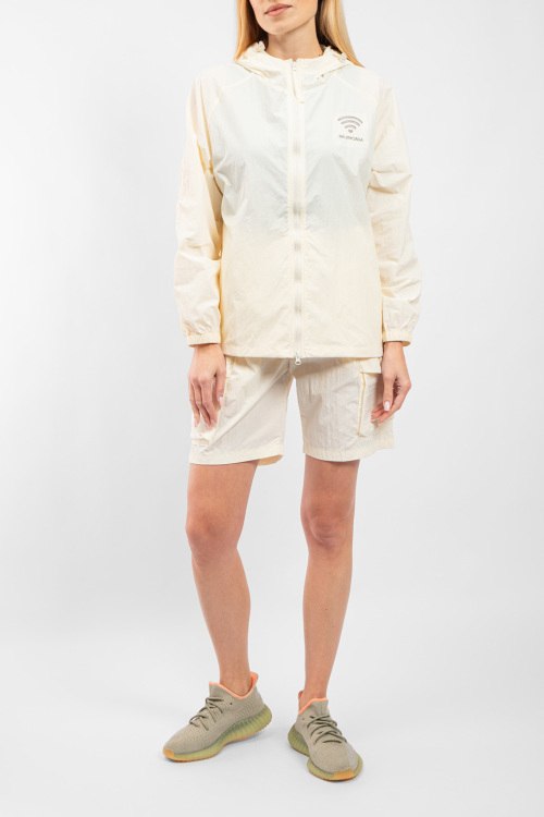 Детали: Женский кремовый спортивный костюм от Balenciaga (Баленсиага). Ветровка: вшитый капюшон, логотип на груди, боковые карманы, застежка-молния, манжеты на резинке. Шорты: эластичный пояс на затяжке, боковые карманы, накладные карманы-карго, вышитый логотип, длина выше колен