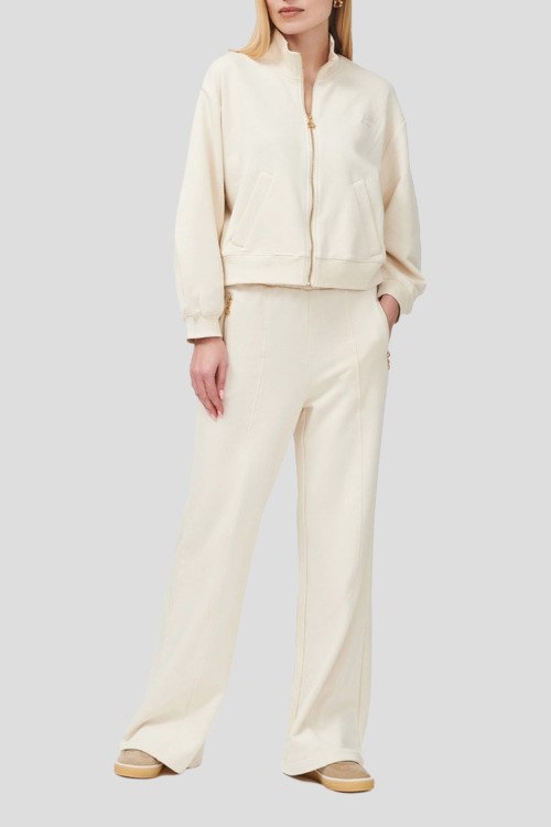 Детали: Женский кремовый хлопковый спортивный костюм от TWINSET (Твинсет). Кофта: вышитый логотип на груди, воротник-стойка, боковые карманы, застежка-молния, классическая длина, трикотажные манжеты и нижний край. Брюки: эластичный пояс, боковые карманы на молнии, полная длина