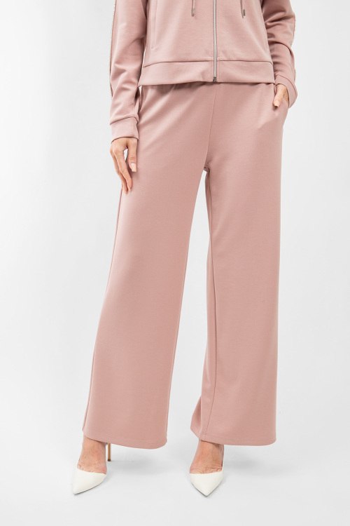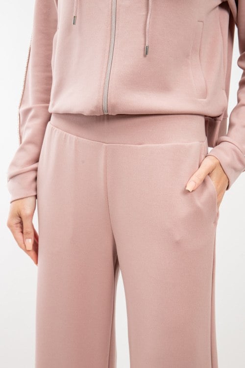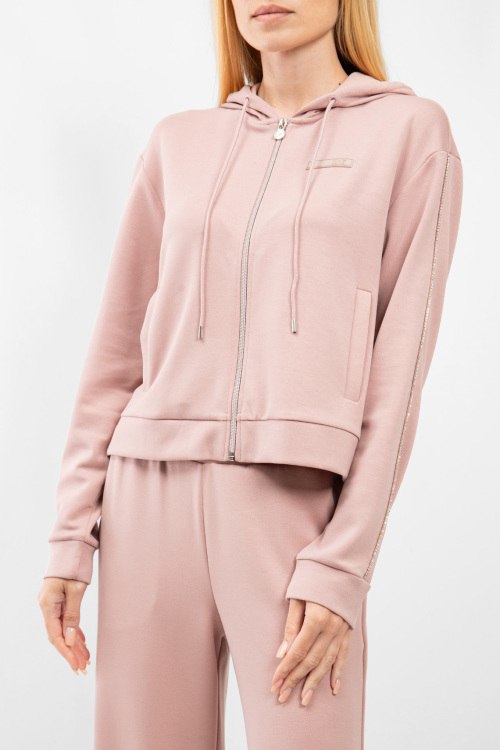 Женский розовый трикотажный спортивный костюм от EA7 Emporio Armani (ЕА7 Эмпорио Армани). Кофта: капюшон на завязках, логотип на груди, кристаллы вдоль рукавов, боковые карманы, застежка-молния, классическая длина. Брюки: эластичный пояс, боковые карманы, широкий крой, полная длина.