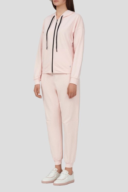Детали: Женский пудровый спортивный костюм из хлопкового микса от Deha (Деха). Кофта: капюшон на завязках, боковые карманы, застежка-молния, трикотажные манжеты, классическая длина. Брюки: эластичный пояс на завязках, боковые карманы, трикотажные манжеты, полная длина. Параметры модели: 78-62-92, рост 179 см. На модели надет: M размер