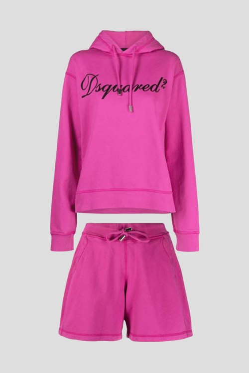 Детали: Женский розовый спортивный костюм Sorry, I'm busy из хлопка от Dsquared2 (Дискваред). Худи классической длины, вшитый капюшон, длинные рукава, трикотажная резинка на манжетах и по низу изделия, принт с логотипом бренда на груди. Короткие шорты свободного силуэта, эластичная резинка на поясе с кулиской, боковые карманы