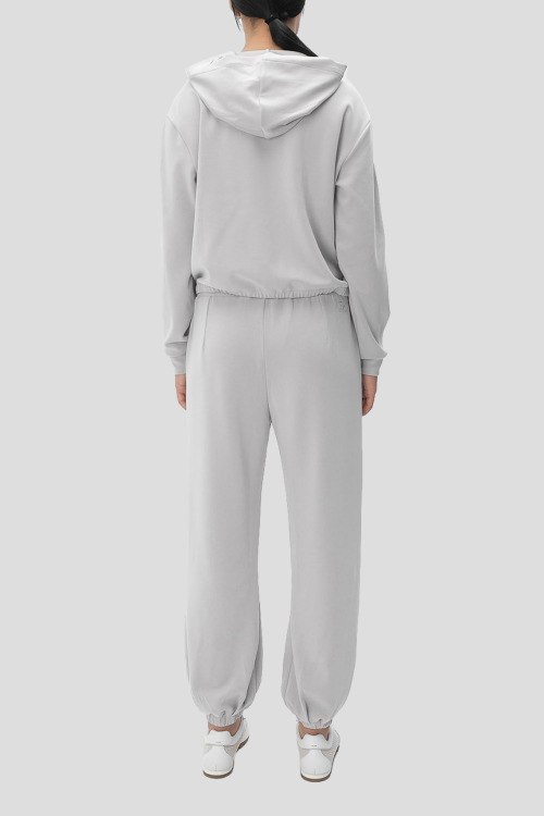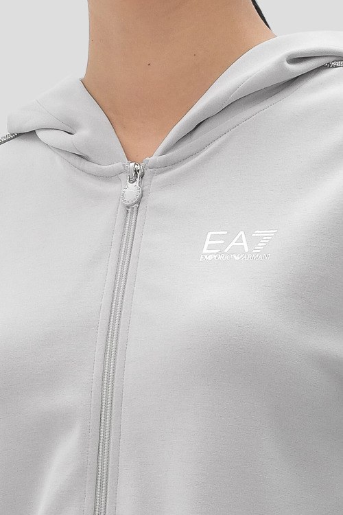Детали: Женский светло-серый спортивный костюм от EA7 Emporio Armani (ЕА7 Эмпорио Армани). Кофта: модель с капюшоном, логотип на груди, кристаллы вдоль рукавов, застежка-молния, нижний край на резинке. Брюки: эластичный пояс, боковые карманы, декор кристаллами, манжеты на резинке, полная длина