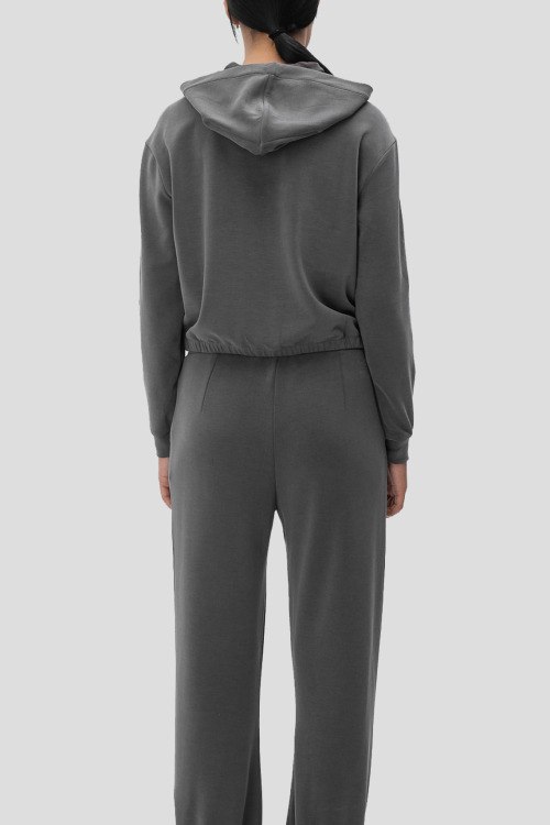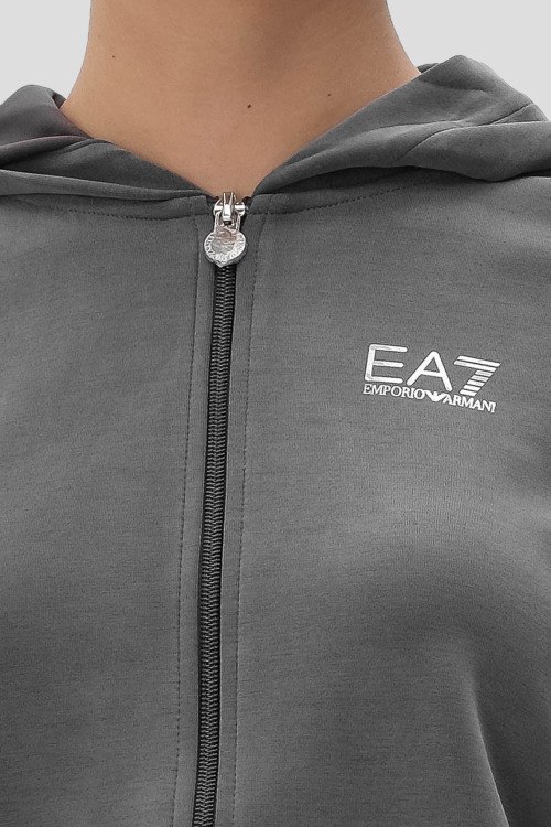 Детали: Женский темно-серый спортивный костюм от EA7 Emporio Armani (ЕА7 Эмпорио Армани). Кофта: модель с капюшоном, логотип на груди, кристаллы вдоль рукавов, застежка-молния, нижний край на резинке. Брюки: эластичный пояс, боковые карманы, декор кристаллами, манжеты на резинке, полная длина
