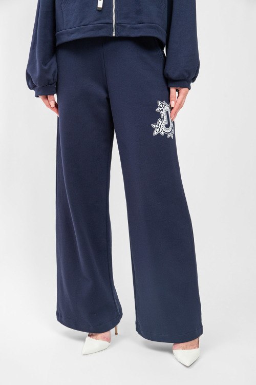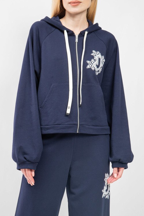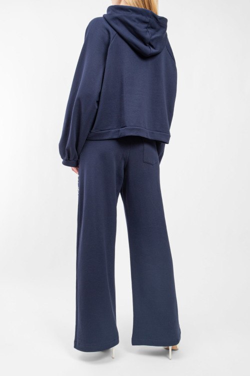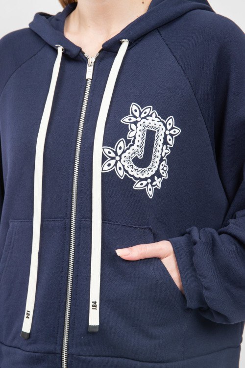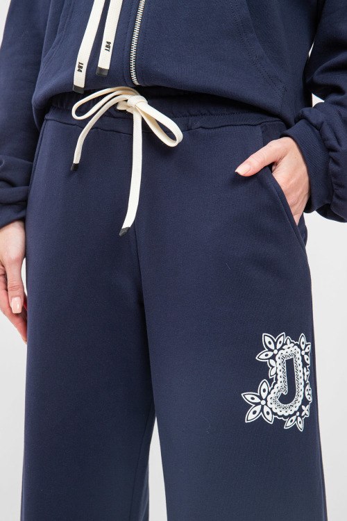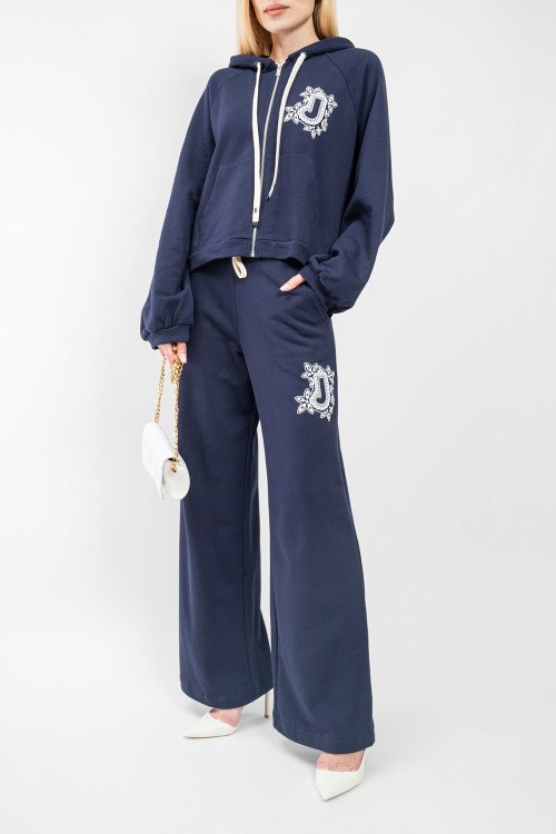 Женский темно-синий хлопковый спортивный костюм от J.B4 Just Before (Джаст Бифо). Кофта: капюшон на завязках, принт с логотипом на груди, боковые карманы, застежка-молния, классическая длина. Брюки: эластичный пояс на завязках, боковые карманы, принт с логотипом, широкий крой, полная длина.