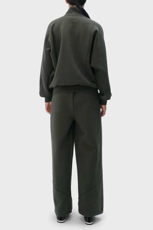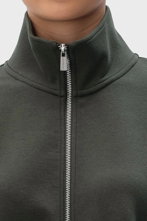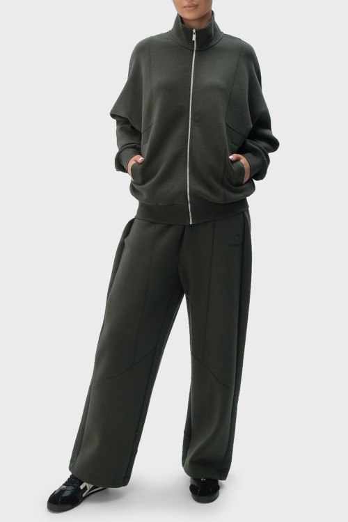 Детали: Женский темно-зеленый хлопковый спортивный костюм от Trussardi (Труссарди). Кофта: высокий воротник, боковые карманы, застежка-молния, классическая длина, трикотажные манжеты и нижний край. Брюки: эластичный пояс, вышитый логотип, боковые карманы, широкий крой, полная длина