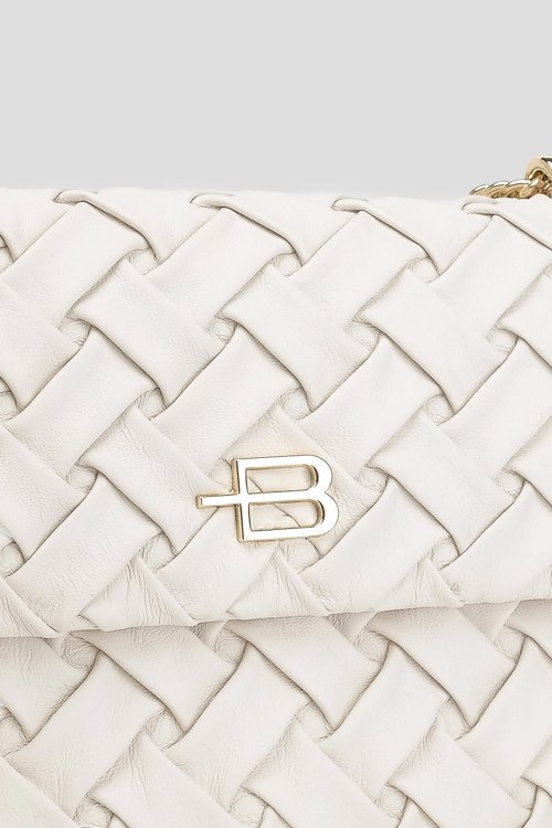 Детали: Женская белая кожаная сумка кросс-боди от Baldinini (Балдинини). Плетеный дизайн, значок с логотипом, золотистая фурнитура, цепочка на плечо, застежка на магнит, одно отделение