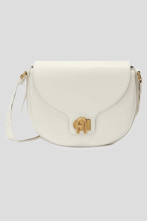Детали: Женская белая кожаная сумка кросс-боди Lotus от Furla (Фурла). Модель из зернистой кожи, золотистая фурнитура, застежка на поворотный замок, одно отделение, регулируемый плечевой ремень. Размер: 24 х 15 х 7,5 см