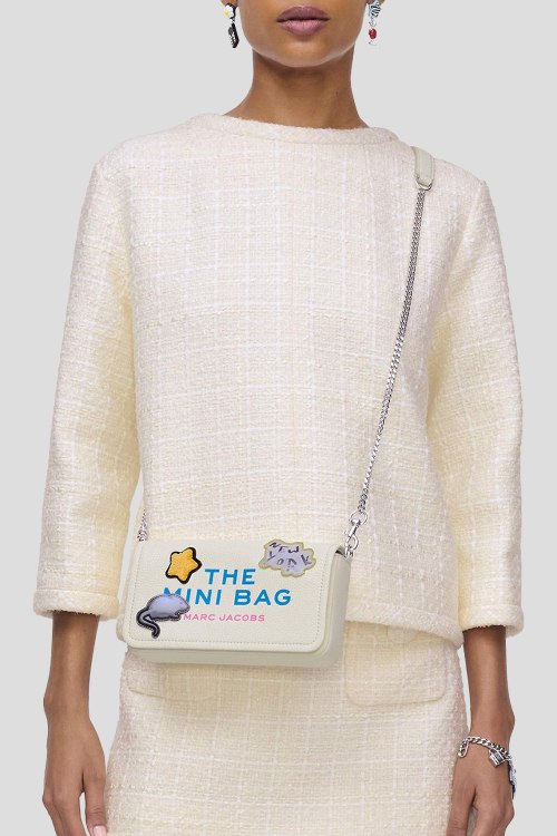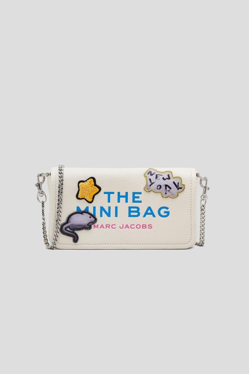 Детали: Женская белая кожаная сумка кросс-боди The Sticker Patch Mini Bag от Marc Jacobs (Марк Джейкобс). Модель из зернистой кожи, принт с логотипом, разноцветные нашивки, серебристая фурнитура, цепочка на плечо, застежка на магнит, одно отделение. Размеры: длина 20 см, глубина 5 см, высота 12 см