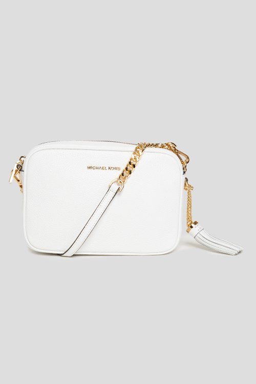 Женская белая кожаная сумка кросс-боди Jet Set от Michael Kors (Майкл Корс). Значок с логотипом, золотистая фурнитура, декор кисточкой, регулируемый плечевой ремень, застежка-молния, одно основное отделение. Измерения: 21.5х14х6 см