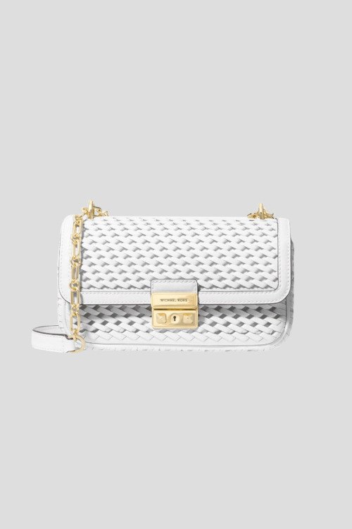 Детали: Женская белая кожаная сумка кросс-боди Tribeca от Michael Kors (Майкл Корс). Модель из гладкой кожи, плетеный дизайн, тиснение логотипа, золотистая фурнитура, плечевой ремень, застежка на магнит, одно отделение. Размеры: ширина 23 см, глубина 6 см, высота 12,5 см; ремень 53 см