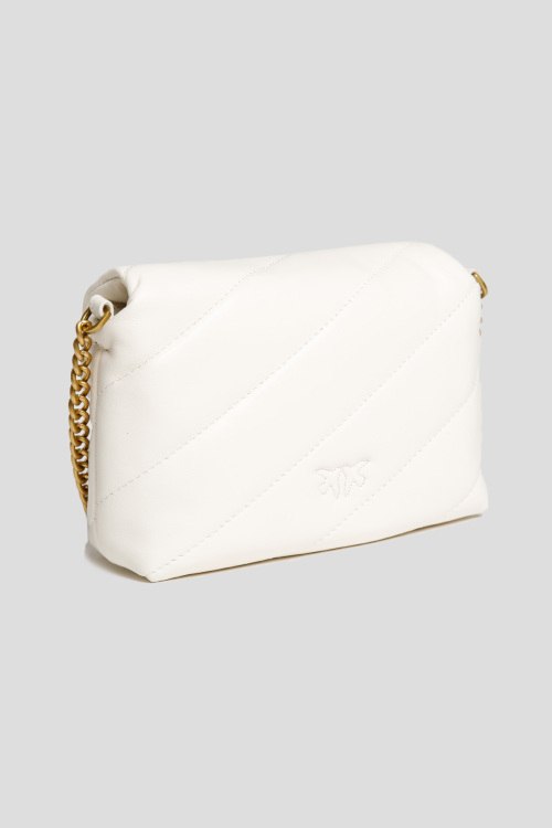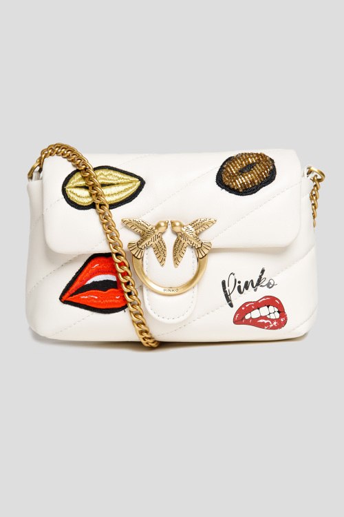 Женская белая сумка кросс-боди Red Lips Love Baby Puff из натуральной кожи от Pinko (Пинко). Стеганый дизайн, яркие нашивки, застежка с клапаном на магнит, одно отделение, открытый внутренний карман, фирменный логотип Love Birds Diamond Cut, плечевой ремень-цепочка. Размер: высота 13 см, ширина 18,5 см, глубина 5,5 см, высота ручки 52 см
