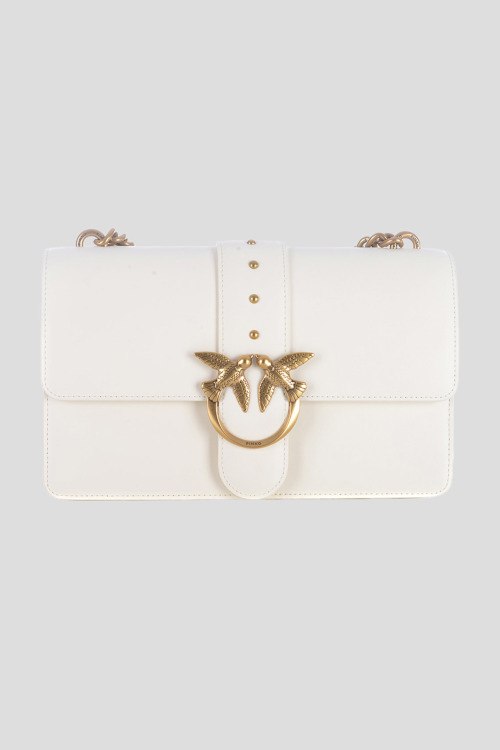 Детали: Женская белая кожаная сумка кросс-боди Love One Classic от Pinko (Пинко). Модель из гладкой кожи, логотип Love Birds, декор заклепками, золотистая фурнитура, застежка на магнит, одно отделение, цепочка на плечо. Размеры: 27 x 17 x 7 см