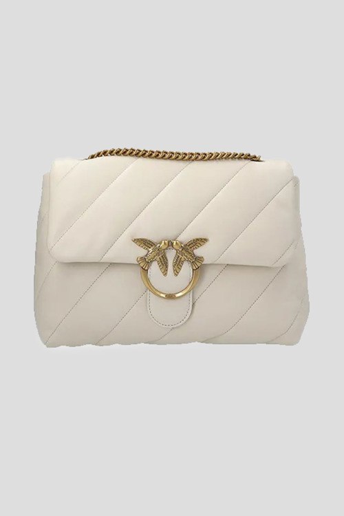 Детали: Женская белая кожаная сумка кросс-боди Love Big Puff от Pinko (Пинко). Модель из гладкой кожи, стеганый дизайн, логотип Love Birds, золотистая фурнитура, застежка на магнит, одно отделение, цепочка на плечо. Размеры: 31 x 11 x 21 см