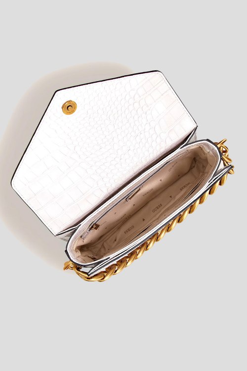 Детали: Женская сумка кросс-боди молочного оттенка из экокожи Retour от Guess (Гесс). Тиснение под кожу крокодила, значок с логотипом, клапан с магнитной кнопкой, съемный регулируемый ремень, не съемная ручка в виде цепочки, одно внутреннее отделение, один карман на молнии, один карман без молнии, карман для карточек, снаружи один карман на молнии. Размер: 23x19x6 см, высота ручки/ремня: 4,5/55-65 см (производитель не комплектует пыльниками кошельки и маленькие сумки)