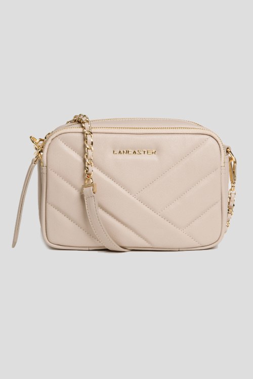 Женская бежевая кожаная сумка кросс-боди от Lancaster (Ланкастер). Стеганый дизайн, значок с логотипом спереди, золотистая фурнитура, регулиуемый плечевой ремень, застежка-молния, одно основное отделение, внутренний карман на молнии. Замеры: высота 15 см, ширина 22 см, глубина 6,5см (1,5 см+5 см), длина регулируемой ручки 103 см минимальная/123 см максимальная.