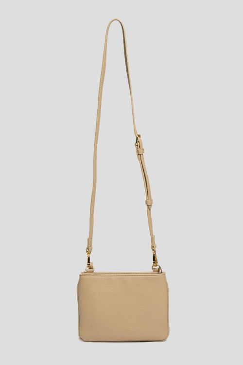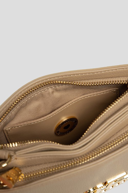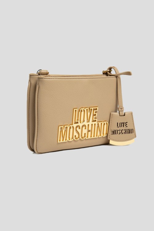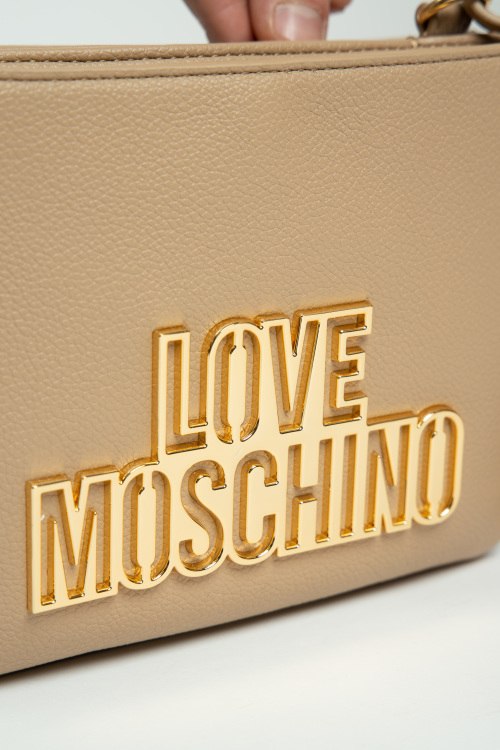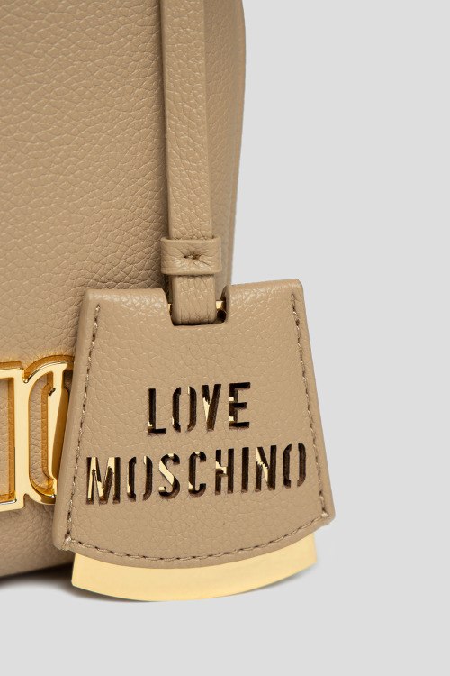 Женская бежевая сумка кросс-боди из экокожи от Love Moschino (Лав Москино). Металлический логотип, подвеска с логотипом, золотистая фурнитура, регулируемый плечевой ремень, застежка-молния, два отделения. Размеры: 20,5 х 15 х 4,5 см