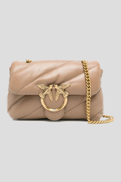 Детали: Женская бежевая кожаная сумка кросс-боди Mini Love Bag Puff от Pinko (Пинко). Модель из гладкой кожи, стеганый дизайн, логотип Love Birds, золотистая фурнитура, застежка на магнит, одно отделение, цепочка на плечо. Размеры: глубина 10 см, высота 14 см, ширина 21 см, длина цепочки 55 см