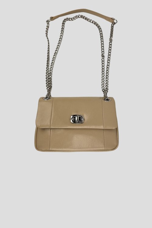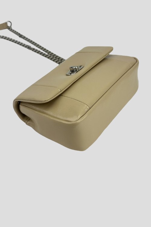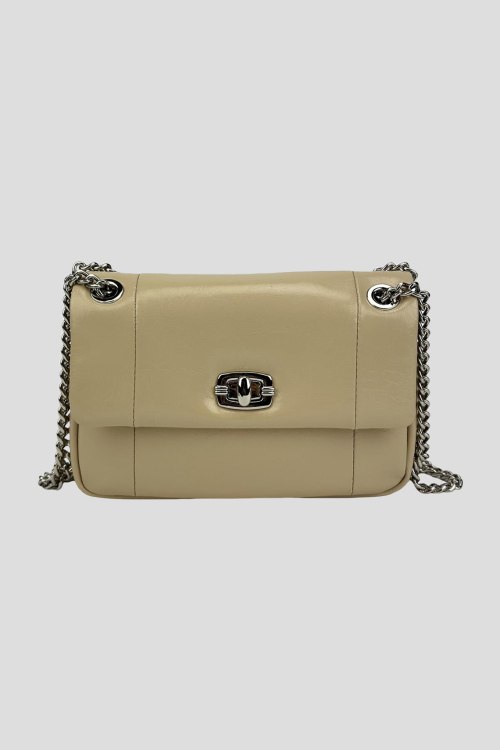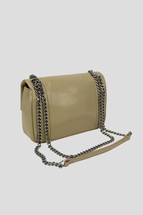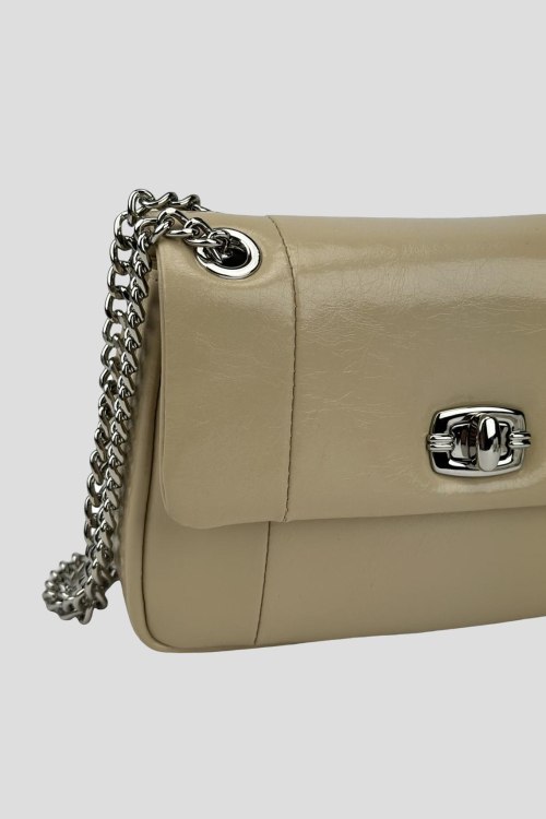 Детали: Женская бежевая сумка кросс-боди из натуральной кожи от UnaBorsetta (УнаБорсетта). Один основной отдел на механической застежке, внутри есть кармашек на молнии для мелких предметов, ремешок в виде цепочки. Размер: 20 x 13 x 6 см.