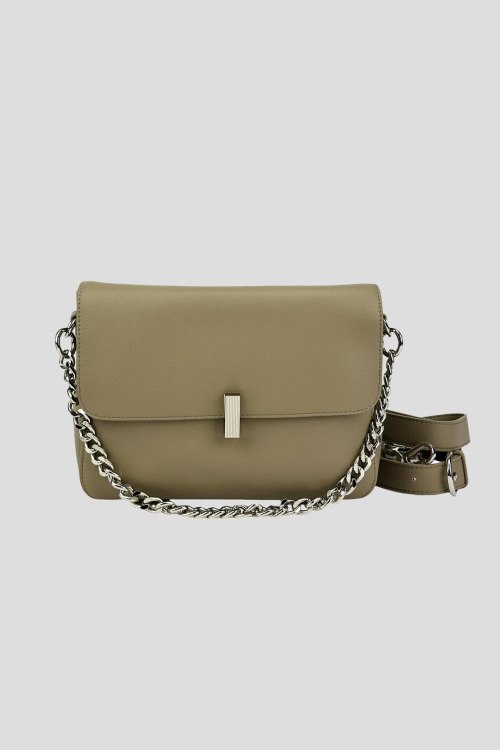 Детали: Женская темно-бежевая сумка кросс-боди из натуральной кожи от UnaBorsetta (УнаБорсетта). Одно отделение, дизайн с клапаном на металлической застежке, дополнительная сумка на молнии, ручка-цепочка, регулируемый плечевой ремень. Размер: 22 x 17 x 7 см.