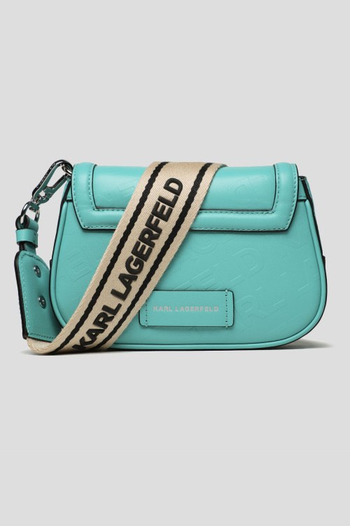 Женская бирюзовая сумка кросс-боди из натуральной кожи от Karl Lagerfeld (Карл Лагерфельд). Одно отделение, дизайн с клапаном на магнитной застежке, съемный текстильный ремень с логотипом, металлический логотип бренда серебристого цвета. Измерения: высота: 13,5 см, длина: 19,5 см, ширина: 7,5 см