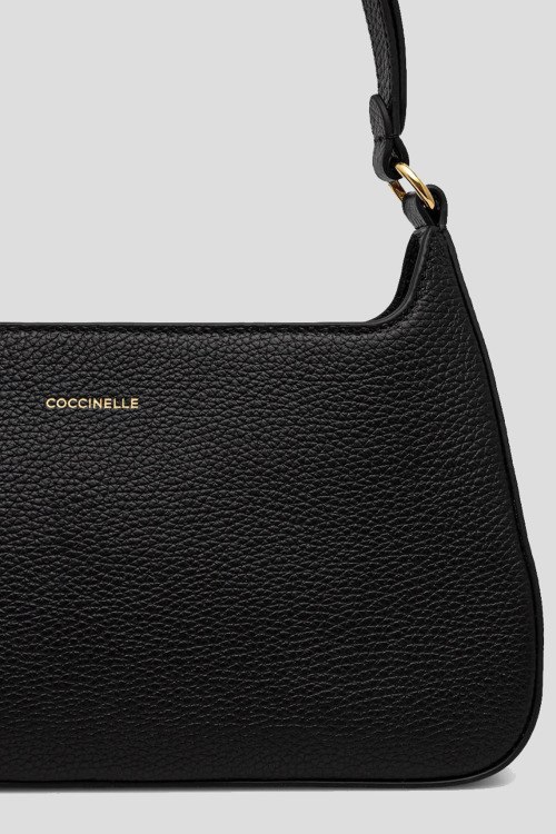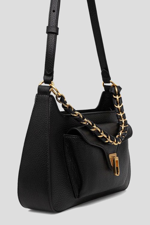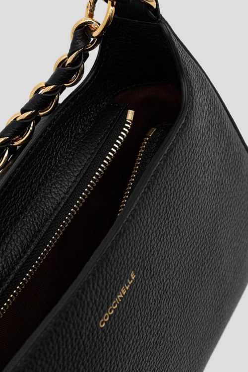 Детали: Женская черная кожаная сумка кросс-боди Beat Generation от Coccinelle (Кочинелле). Модель из зернистой кожи, золотистая фурнитура, накладной передний карман, декор цепью, регулируемый плечевой ремень, застежка-молния, одно отделение. Размеры: 25 x 13 x 5 см