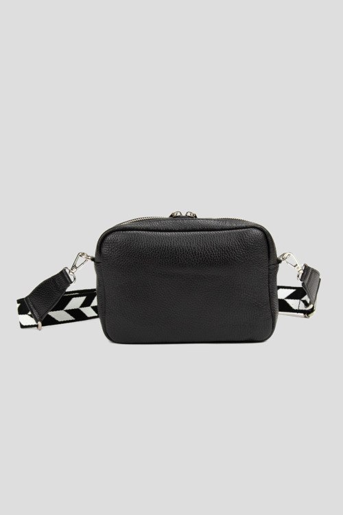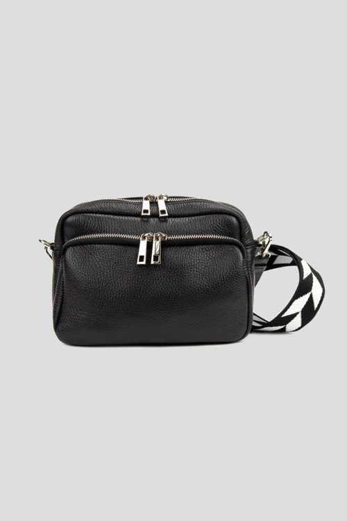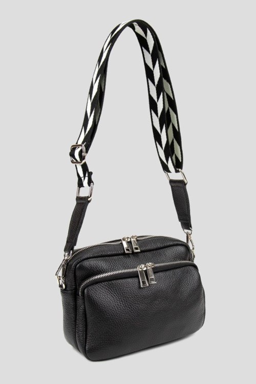 Детали: Женская черная сумка кросс-боди из натуральной кожи от Firenze Italy (Фирензе Итали). Одно основное отделение, застежка на молнию, внешний карман на молнии, текстильный плечевой ремень с узором, серебристая фурнитура. Размер: 22 x 7 x 15 см