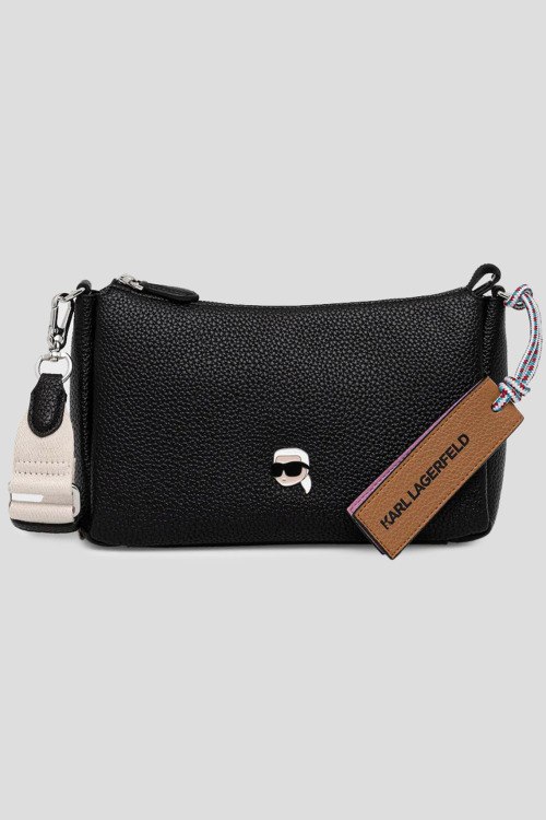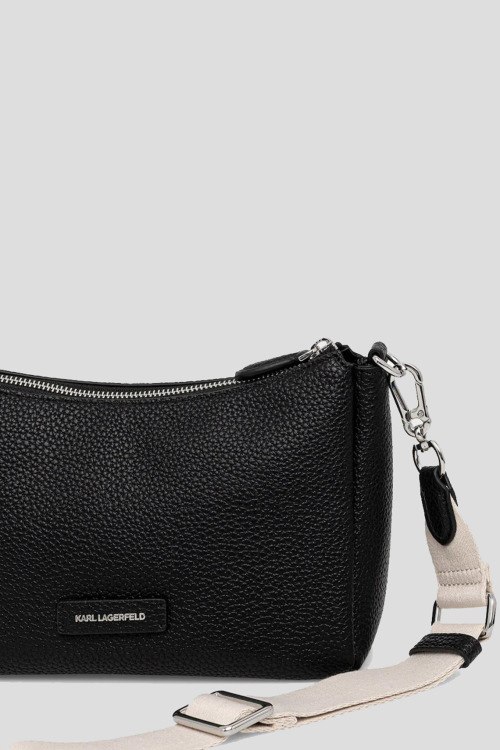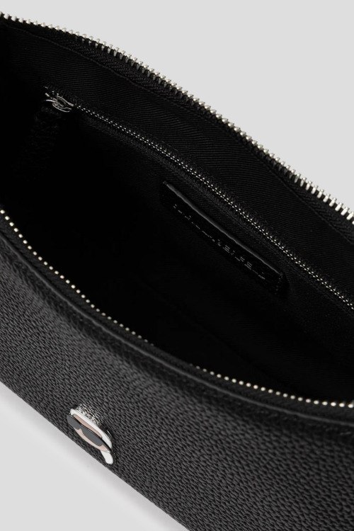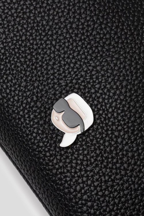 Детали: Женская черная сумка кросс-боди из экокожи Ikon Pebble от Karl Lagerfeld (Карл Лагерфельд). Модель из зернистой кожи, логотип спереди, серебристая фурнитура, застежка-молния, одно отделение, текстильный плечевой ремень. Размеры: 24 x 15 x 8 см