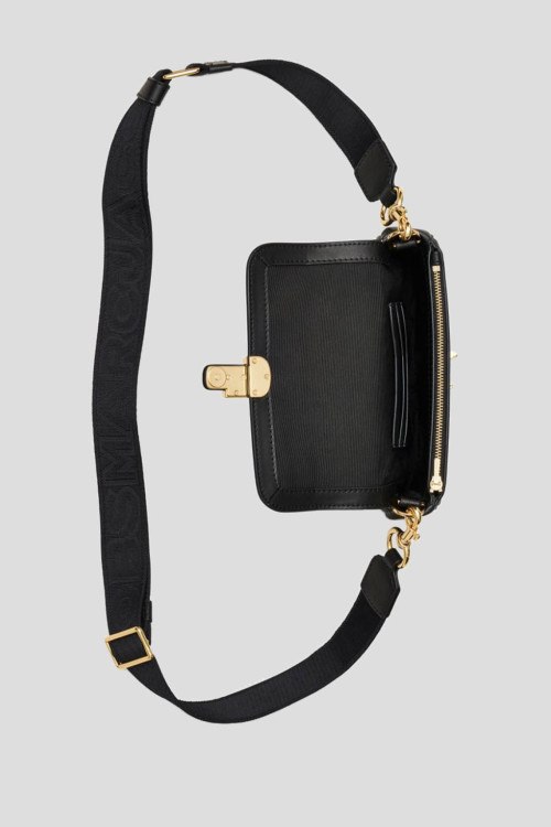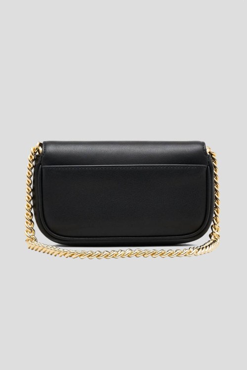 Детали: Женская черная кожаная сумка кросс-боди The J Marc Mini от Marc Jacobs (Марк Джейкобс). Модель из гладкой кожи, логотип спереди, золотистая фурнитура, брендированный плечевой ремень, крупная цепочка, застежка на магнит, одно отделение, один внутренний карман. Размеры: 19 x 4 x 11 см; высота ручки 23 см; максимальная длина регулируемого плечевого ремня 144 см
